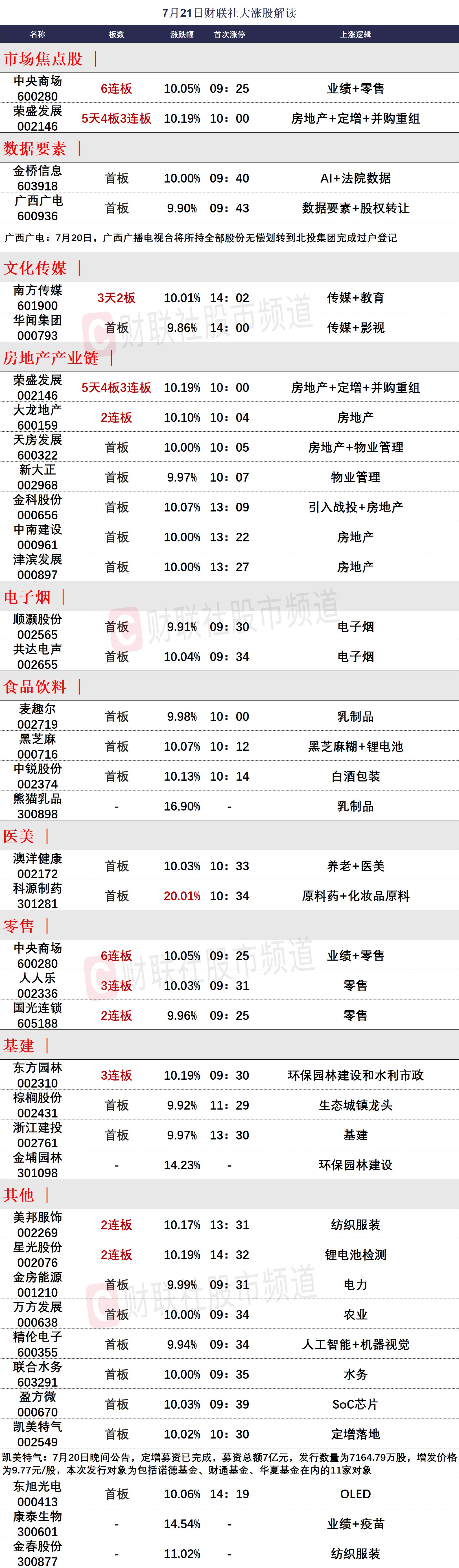 今日共33股涨停,连板股总数8只,9股封板未遂,封板率为78%(不含ST股、退市股及未开板新股)。个股方面,零售板块中央商场6板、人人乐3板、国光连锁2板,地产股荣盛发展5天4板、大龙地产2板,环保+基建的东方园林3板,电池检测概念股星光股份2板,纺织股美邦服饰2板,传媒股南方传媒3天2板。今日收涨个股2081只,收跌个股2712只。