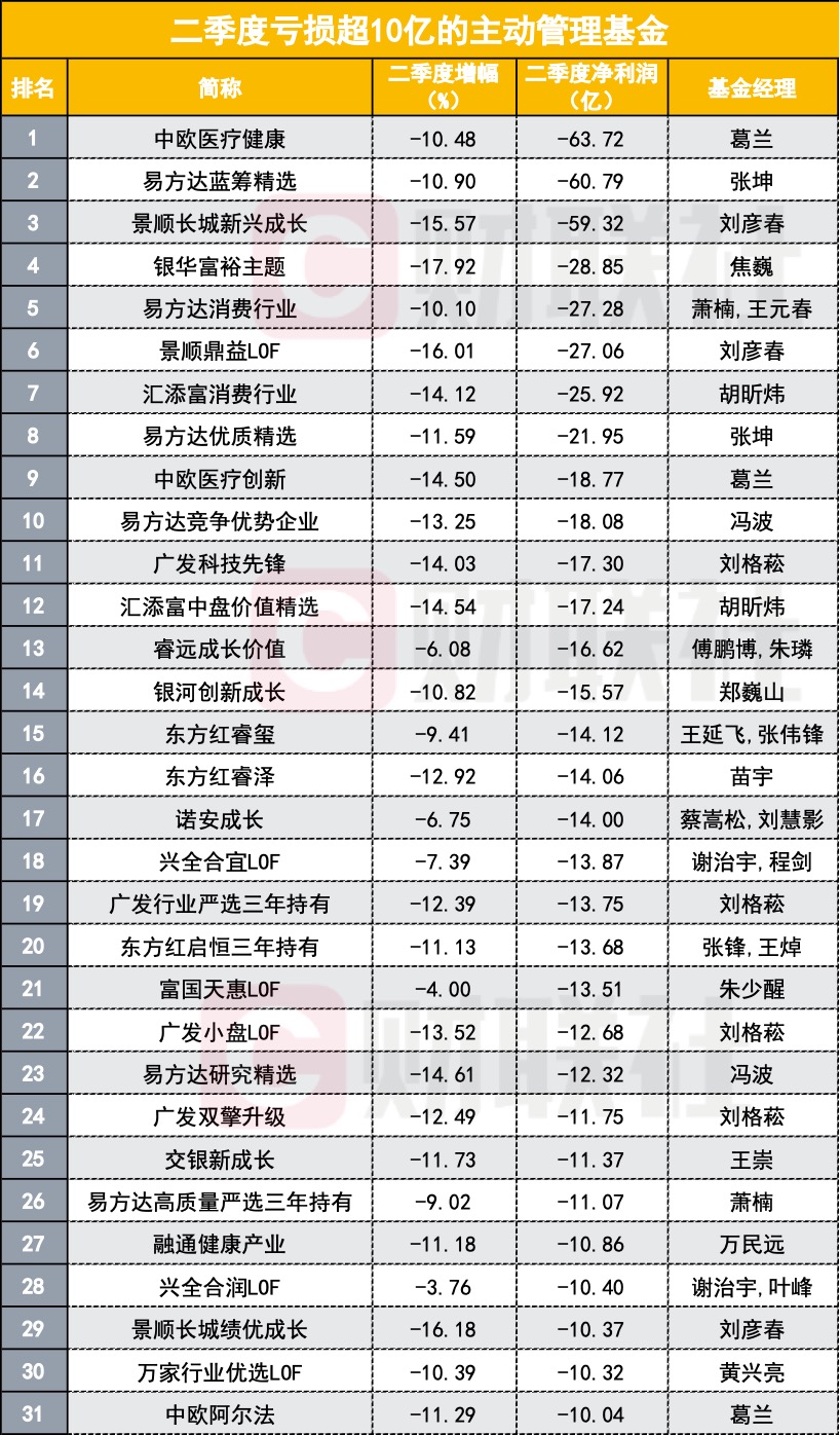 二季度31只主动管理基金亏损超10亿 整体浮亏2200亿