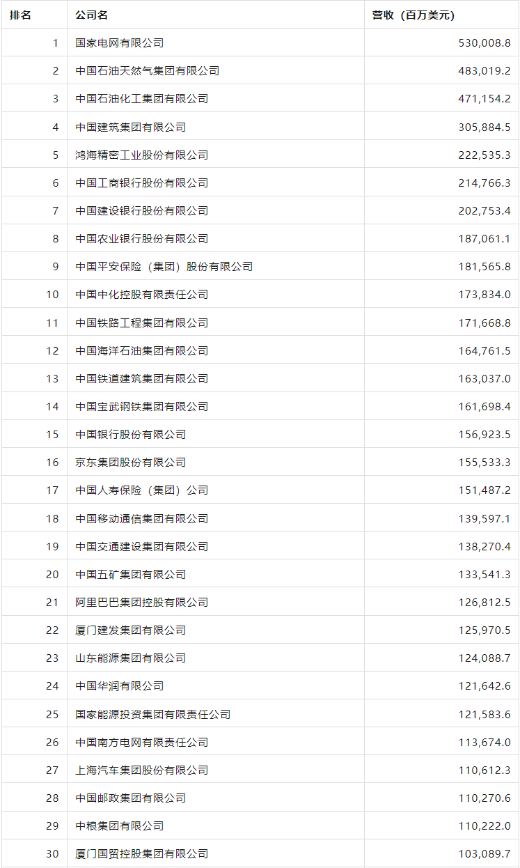 财联社7月25日电,今年500家上榜的中国公司在2022年的总营业收入达到15万亿美元,净利润达到7,171亿美元。国家电网有限公司以5,300亿美元的营收位居榜首,中国石油和中国石化分列榜单第二位和第三位,位列第四位的是中国建筑集团。苹果最大代工企业鸿海精密位列第五,是排名最高的台湾地区公司。中国平安保险(集团)股份有限公司是榜单前十位内唯一的大陆民营企业,位列第九位。总部位于中国香港、屈臣氏的母公司长江和记实业有限公司位列第129位。