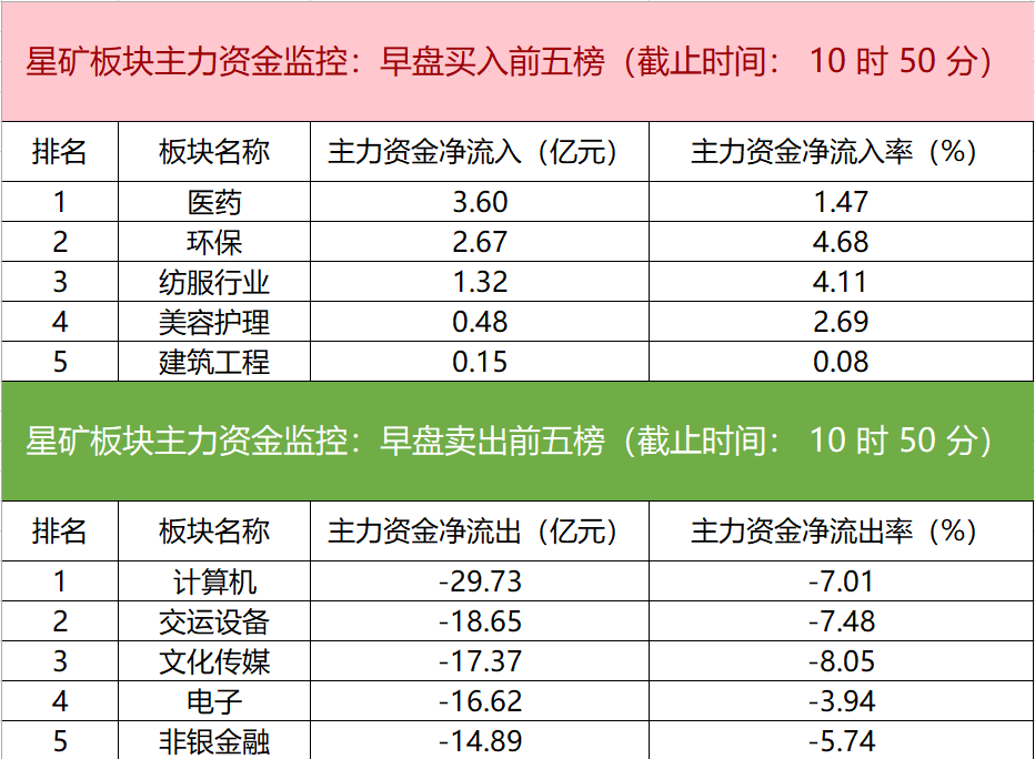 财联社7月26日电,财联社星矿数据显示,今日早盘主力资金净流入医药、环保、纺服行业等板块,净流出计算机、交运设备、文化传媒等板块,其中计算机板块净流出超29亿元。个股方面,N威迈大涨,主力资金净买入4.00亿元,太平洋、N君逸、剑桥科技获主力资金净流入居前;长安汽车遭净卖出超5亿元,东方财富、首创证券、中兴通讯主力资金净流出额居前。