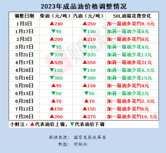 财联社7月26日电,国内成品油价迎年内首次“三连涨”。国家发改委发布消息称,自24时起,国内汽油价格和柴油价格分别上调275元/吨和260元/吨。折合升价,92号汽油和0号柴油均上调0.22元,95号汽油上调0.23元。以油箱容量为50升的小型私家车计算,车主们加满一箱油将多花10.5元左右;对满载50吨的大型物流运输车辆而言,每平均行驶100公里,燃油费用增加8.8元左右。调价后,全国大多数地区的车柴价格和92号汽油零售价在7.2-7.3元/升左右。95号汽油则普遍在8元/升以上,全面进入“8元时代”。