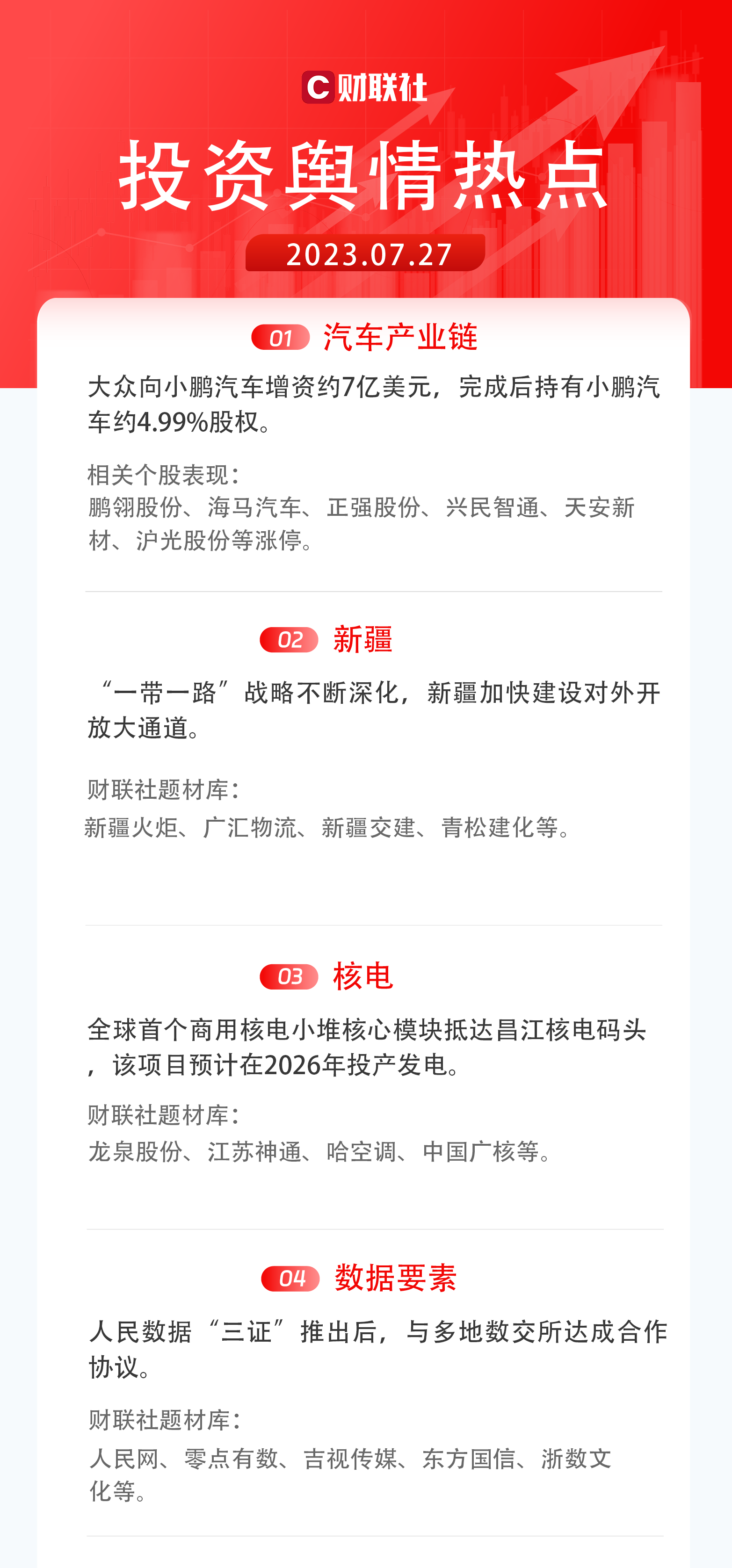 1)汽车产业链:大众向小鹏汽车增资约7亿美元,完成后持有小鹏汽车约4.99%股权。