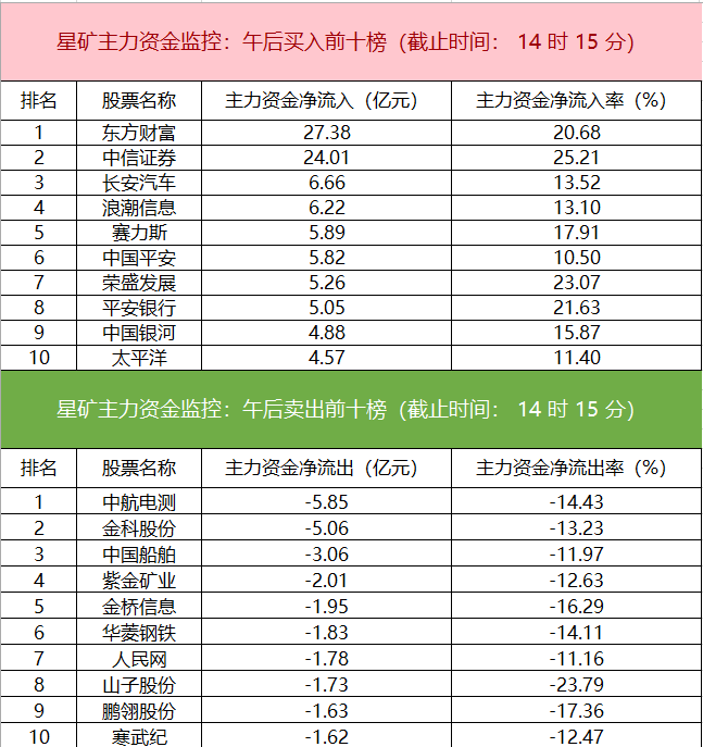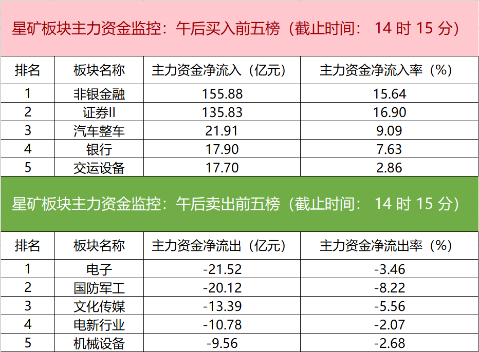 财联社7月28日电,财联社星矿数据显示,今日主力资金净流入非银金融、证券Ⅱ、汽车整车等板块,净流出电子、国防军工、文化传媒等板块,其中非银金融板块净流入155.88亿元。个股方面,东方财富大涨,主力资金净买入27.38亿元,中信证券、长安汽车、浪潮信息获主力资金净流入居前;中航电测遭净卖出超5亿元,金科股份、中国船舶、紫金矿业等主力资金净流出额居前。