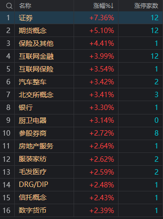 财联社7月28日电,大盘全天低开高走,三大指数均涨超1.5%,上证50指数涨近3%。盘面上,大金融股集体走强,券商股掀涨停潮,中信证券、天风证券、中国银河、太平洋等超10股涨停。消费股盘中活跃,零售股领涨,中兴商业、国芳集团涨停,贵州茅台涨超3%。房地产板块震荡走高,荣盛发展、城建发展涨停。汽车产业链个股探底回升,海马汽车、赛力斯等涨停。下跌方面,半导体板块陷入调整,Chiplet方向领跌,易天股份、甬矽电子跌超5%。总体上个股涨多跌少,两市超3500只个股上涨。沪深两市今日成交额9483亿,较上个交易日放量1683亿。板块方面,证券、保险、汽车整车、银行等板块涨幅居前,Chiplet、CPO、传媒、新型城镇化等板块跌幅居前。截至收盘,沪指涨1.84%,深成指涨1.62%,创业板指涨1.62%。北向资金全天净买入164.03亿元,其中沪股通净买入83.82亿元,深股通净买入80.21亿元。