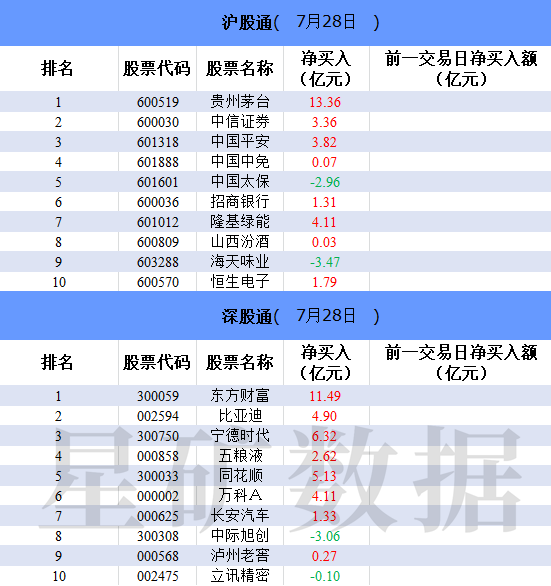 财联社7月28日电,北向资金今日大幅净买入164.03亿元。贵州茅台、东方财富、宁德时代分别获净买入13.36亿元、11.49亿元、6.32亿元。海天味业净卖出额居首,金额为3.47亿元。
