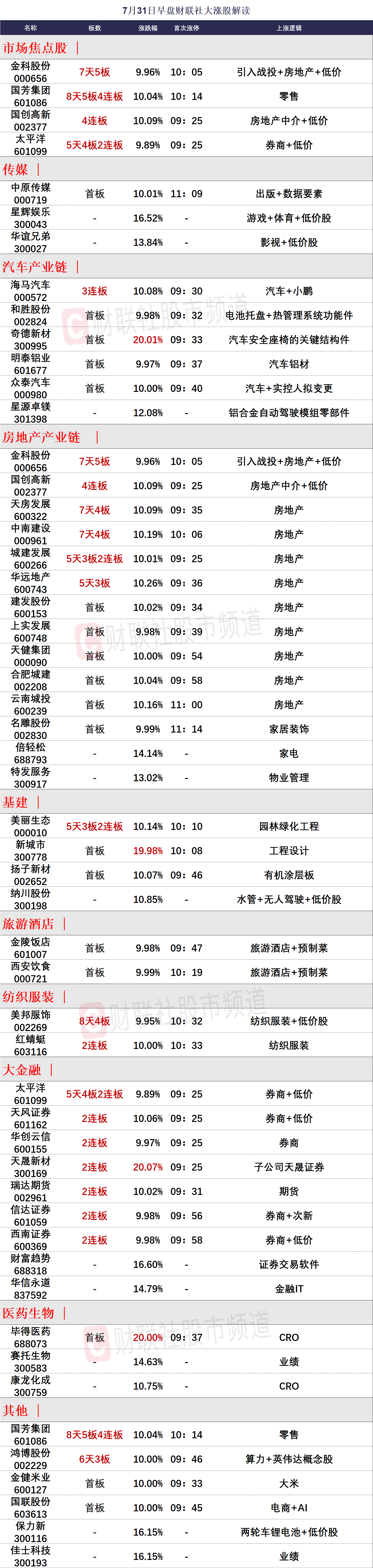 今日午盘两市共37股涨停,连板股总数13只,20股封板未遂,封板率为65%(不含ST股、退市股及未开板新股)。个股方面,地产股金科股份7天5板、国创高新4板、天房发展7天4板、中南建设7天4板,零售股国芳集团8天5板,大金融板块太平洋5天4板、天晟新材创业板2板、天风证券2板。