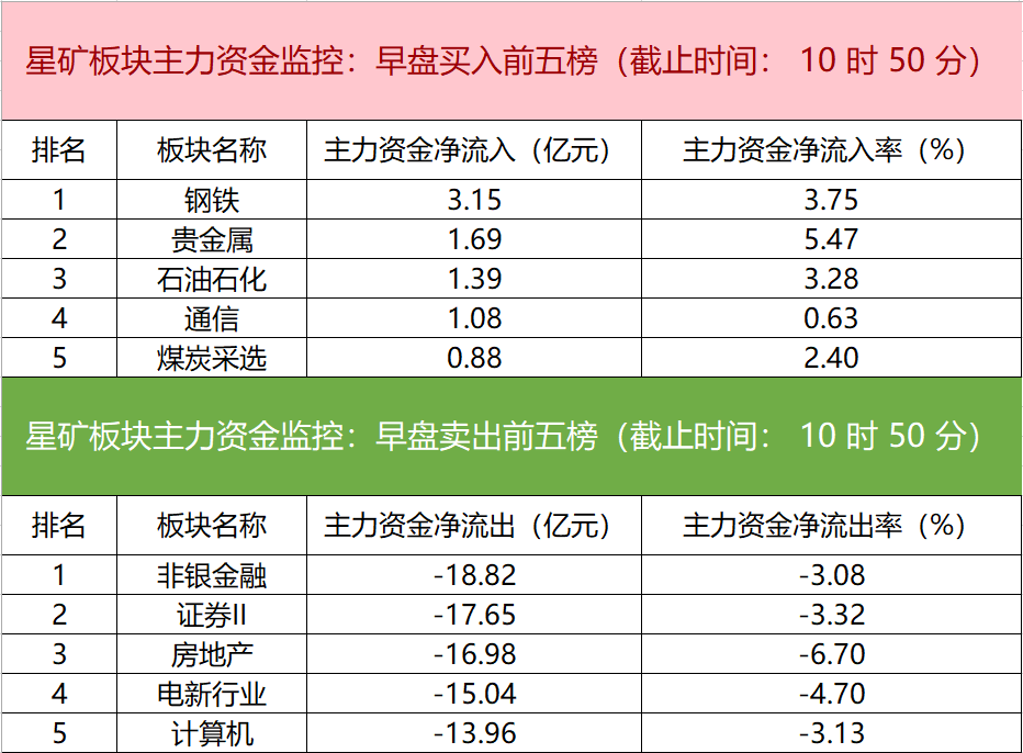 财联社8月1日电,财联社星矿数据显示,今日早盘主力资金净流入钢铁、贵金属、石油石化等板块,净流出非银金融、证券Ⅱ、房地产等板块,其中非银金融板块净流出超18亿元。个股方面,N浙荣大涨,主力资金净买入3.24亿元,N敷尔佳、中际旭创、药明康德获主力资金净流入居前;天风证券遭净卖出超7亿元,金科股份、西安饮食、隆基绿能主力资金净流出额居前。