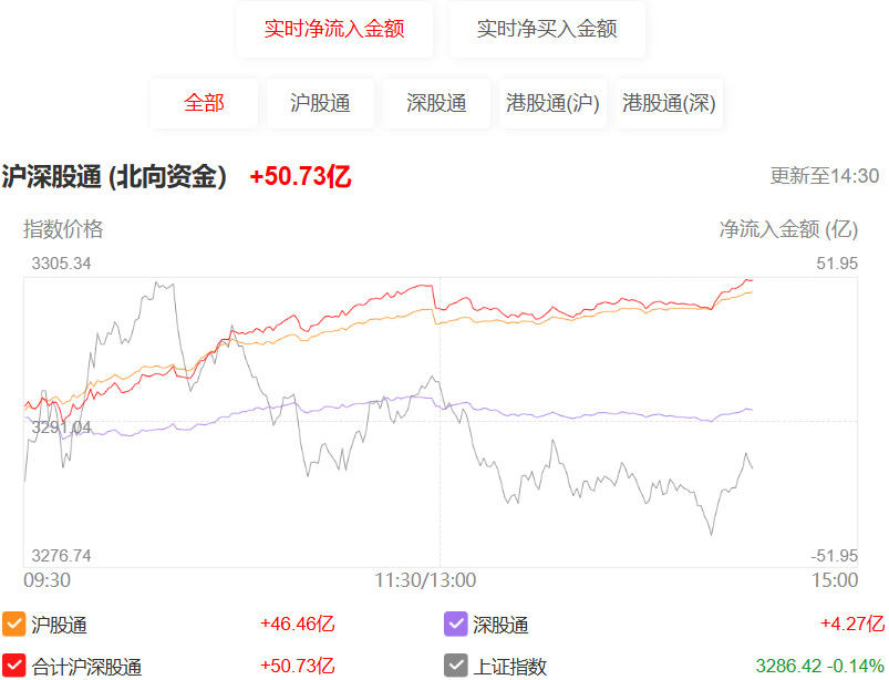 财联社8月1日电,截至发稿,北向资金净流入超50亿元。
