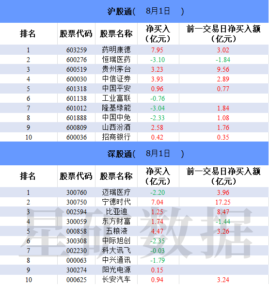 财联社8月1日电,北向资金今日净买入48.54亿元。药明康德、宁德时代、五粮液分别获净买入7.95亿元、7.04亿元、4.47亿元。恒瑞医药净卖出额居首,金额为3.1亿元。