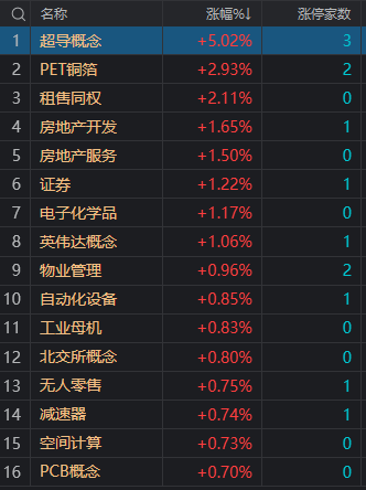 财联社8月2日电,市场早盘低开后震荡调整,沪指领跌,上证50指数跌近1%。盘面上,超导概念股开盘大涨,国缆检测20CM涨停,中孚实业、百利电气涨停。复合集流体概念股展开反弹,宝明科技、英联股份涨停。房地产板块继续活跃,渝开发涨停。券商股一度冲高,财达证券涨停。机器人概念股盘中拉升,新时达涨停。整体上,早盘市场热点呈现快速轮动格局。下跌方面,银行、钢铁、石油等蓝筹股陷入调整,中国石油跌近5%,邮储银行跌近4%。总体上个股跌多涨少,两市超3100只个股下跌。沪深两市今日成交额5396亿,较上个交易日缩量869亿。板块方面,超导概念、复合集流体、房地产、证券等板块涨幅居前,教育、银行、创新药、煤炭等板块跌幅居前。截至收盘,沪指跌0.84%,深成指跌0.42%,创业板指跌0.27%。北向资金方面,沪股通早盘净流出26.04亿,深股通早盘净流出7.98亿。