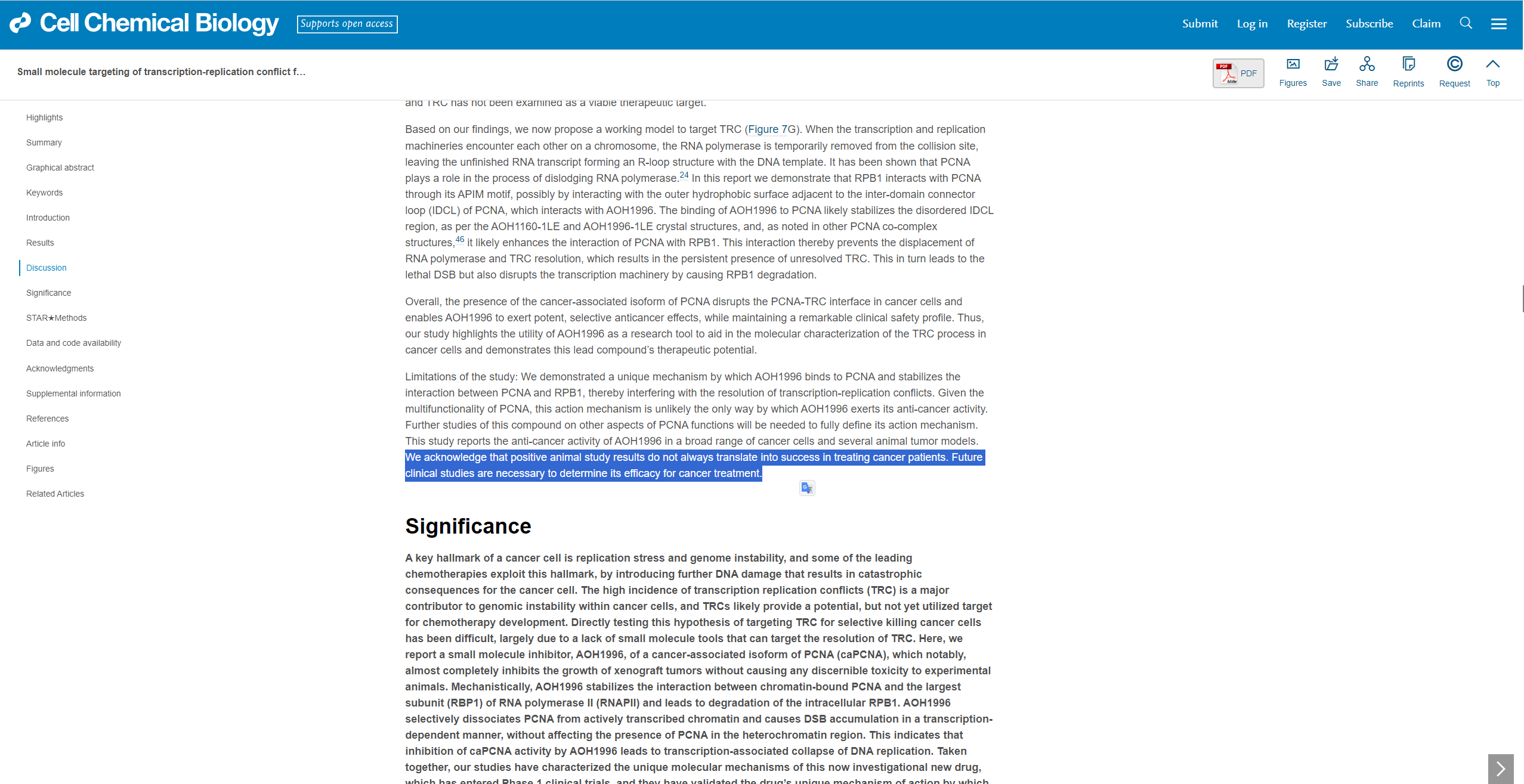 尤为关键的是,CELL官网期刊“讨论”章节中的这一句,表达了研究的局限性——“我们承认,积极的动物研究结果并不总能转化为治疗癌症患者的成功。未来的临床研究需要确定其对癌症治疗的功效。”基本为该项药物的目前所处的研究阶段成果进行了定性。(下图标识部分)