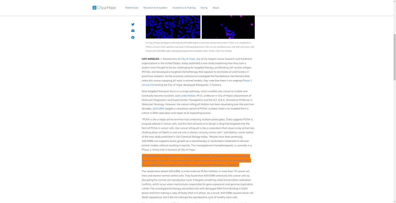特别的是,希望城市(City of Hope)国家医疗中心官网写到:“AOH1996在治疗乳腺癌、前列腺癌、脑癌、卵巢癌、子宫颈癌、皮肤癌和肺癌的细胞的临床前研究中已取得成效。”“而且AOH1996可以口服,且代谢稳定,无论是作为单独治疗还是作为联合治疗,都可以抑制肿瘤生长,但不会引起可察觉的副作用。”(下图标识部分)