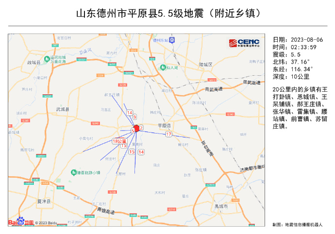 财联社8月6日电,中国地震台网正式测定:08月06日02时33分在山东德州市平原县(北纬37.16度,东经116.34度)发生5.5级地震,震源深度10千米。此次震中距平原县城8公里,距德州市区31公里,距济南市区82公里。本次地震震中附近的乡镇有王打卦镇、恩城镇、王杲铺镇、郝王庄镇、张华镇、雷集镇、腰站镇、前曹镇和苏留庄镇等。