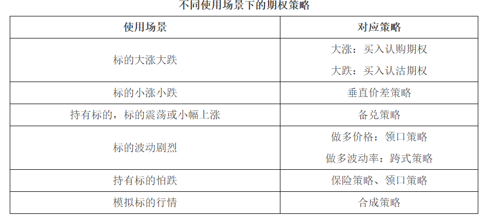 (1)预测标的价格会大涨大跌时,面对大涨,可以买入认购期权;面对大跌,可以买入认沽期权。