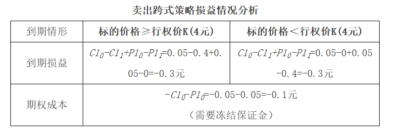 情况一:若到期时,标的价格高于行权价K1=4元时,假设到期标的价格S1=4.4元,卖出的认购期权具有行权价值,此时卖出的认购期权价值C11=S1-K1=4.4-4=0.4元,卖出的认购期权损益为C10-C11=0.05-0.4=-0.35元;卖出的认沽期权将没有行权价值,此时卖出的认沽期权价值P11=0元,卖出的认沽期权损益为P10-P11=0.05-0=0.05元。此时,卖出跨式策略的总损益为C10-C11+P10-P11=-0.35+0.05=-0.3元。随着标的上涨,卖出认购期权更加具有行权价值,潜在亏损C10-C11将不断扩大;卖出的认沽期权将不具有行权价值,价格归零,最大收益即为得到的权利金P10。此时卖出跨式策略的损益为:C10-C11+P10-P11