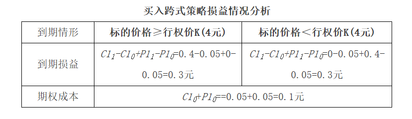 假设期初标的价格S0=4元,行权价K1=4元的近月认购期权价格C10=0.05元,行权价K2=4元的近月认沽期权价格P10=0.05元。买入行权价为K1的认购期权、买入行权价为K2的认沽期权即可构建买入跨式策略。