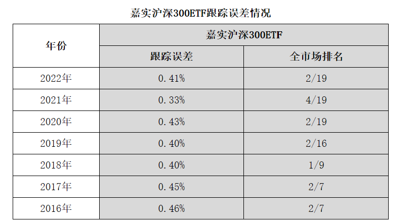 由于ETF属于被动基金,投资者通常用跟踪误差来衡量一支ETF对其所跟踪指数表现的拟合好坏,越低的跟踪误差意味着ETF的收益与指数收益越接近,也表明ETF管理方有更强的ETF基金管理能力。自成立以来,沪深300ETF的跟踪误差排名长期位居市场同类ETF排名前列。