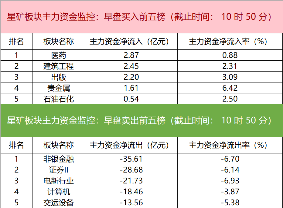 财联社8月8日电,财联社星矿数据显示,今日早盘主力资金净流入医药、建筑工程、出版等板块,净流出非银金融、证券Ⅱ、电新行业等板块,其中非银金融板块净流出超35亿元。个股方面,中金公司一度涨停,主力资金净买入3.66亿元,迈瑞医疗、恒瑞医药、铭普光磁获主力资金净流入居前;太平洋遭净卖出超4亿元,隆基绿能、信达证券、东方财富主力资金净流出额居前。
