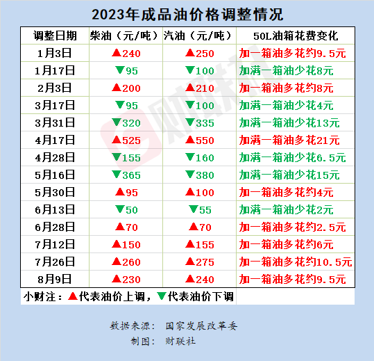 财联社8月9日电,国内成品油价迎“四连涨”。国家发改委宣布,自8月9日24时起,国内汽、柴油价格每吨分别提高240元、230元。按一般家用汽车油箱50L容量估测,加满一箱92号汽油,将多花9.5元。