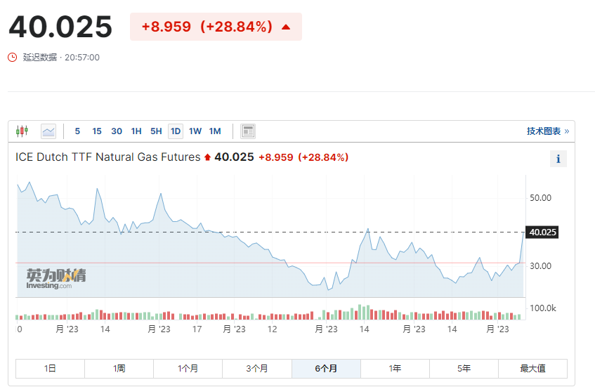 欧洲天然气期货突破40欧元/兆瓦时 日内大涨近30%