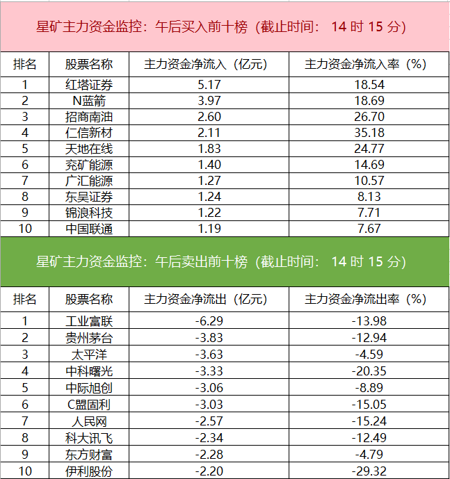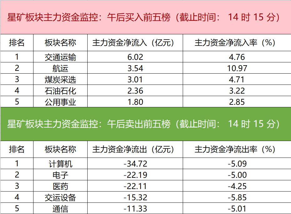 财联社8月10日电,财联社星矿数据显示,今日主力资金净流入交通运输、航运、煤炭采选等板块,净流出计算机、电子、医药等板块,其中计算机板块净流出34.72亿元。个股方面,红塔证券涨停,主力资金净买入5.17亿元,N蓝箭、招商南油、仁信新材获主力资金净流入居前;工业富联遭净卖出超6亿元,贵州茅台、太平洋、中科曙光等主力资金净流出额居前。