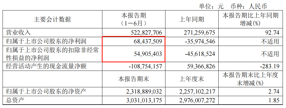 《科创板日报》8月10日讯(记者 郑炳巽) 8月10日晚间,复旦张江(688505.SH)发布2023年半年报。报告期内,实现营收5.23亿元,同比增长92.74%;归母净利润及扣非归母净利润分别为6843.75万元、5490.54万元,去年同期分别亏损3597.45万元、4561.85万元。