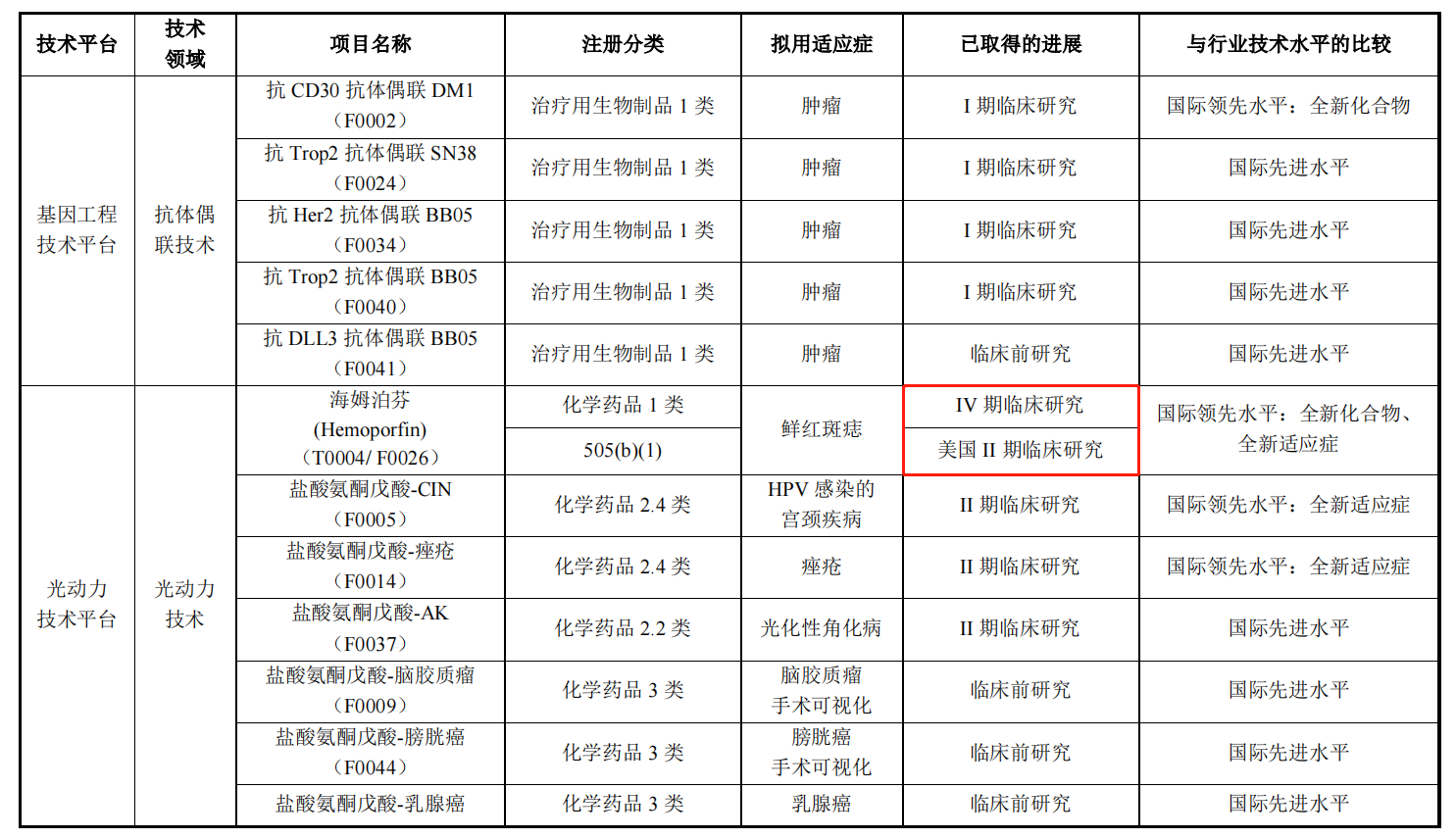 在研项目中,除了海姆泊芬在适应症“鲜红斑痣”上取得IV期临床研究、美国II期临床研究之外,绝大多数产品适应症还处于I期、II期临床研究及临床前研究阶段,距离实现商业化仍有距离。