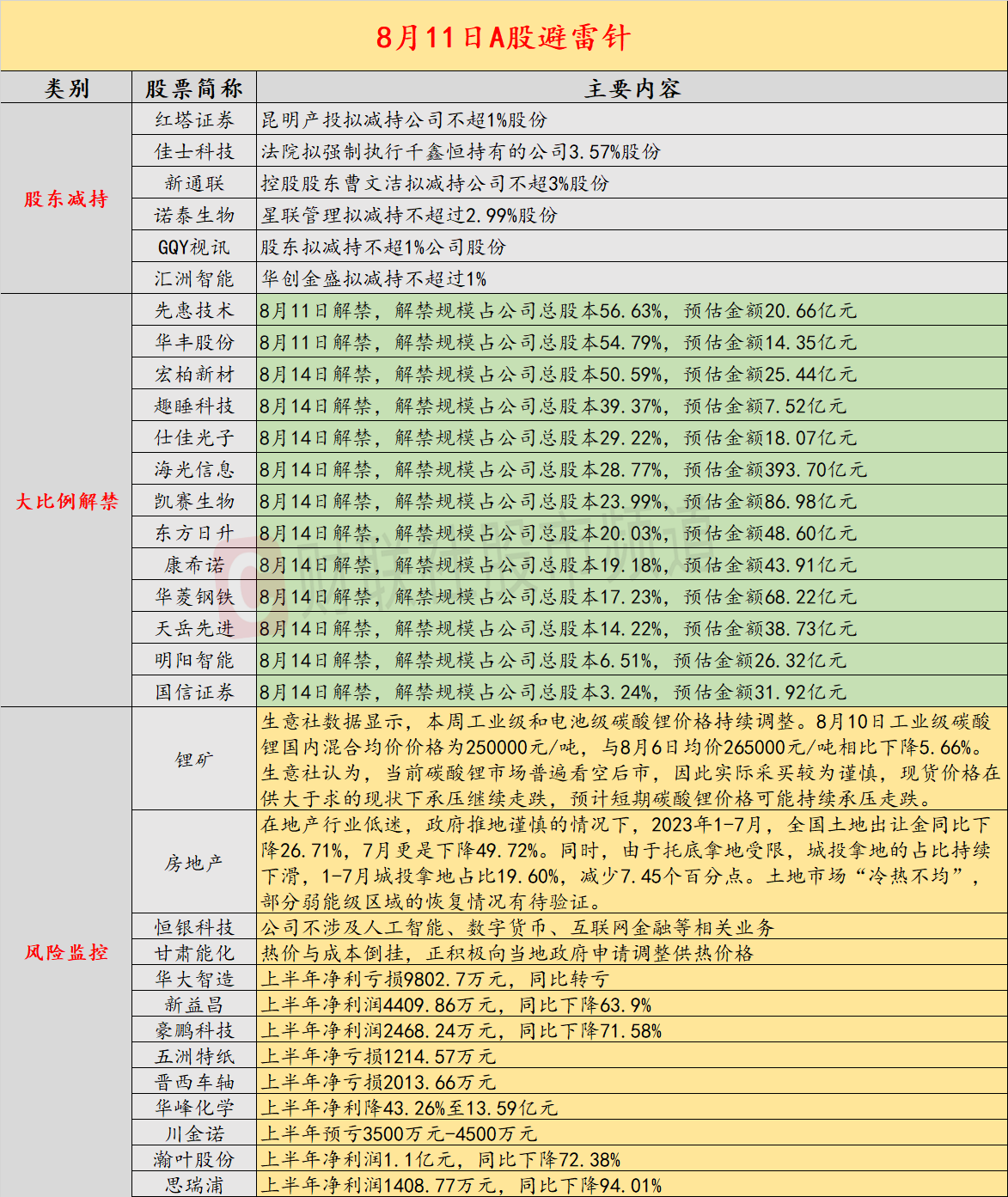 昨日公告的A股拟减持的公司数量较之前有所减少,红塔证券股东昆明产投拟减持公司不超1%股份,新通联控股股东曹文洁拟减持公司不超3%股份;先惠技术、华丰股份将迎来超五成以上解禁;生意社预计短期碳酸锂价格或持续承压走跌;五连板恒银科技公告,公司不涉及人工智能、数字货币、互联网金融等相关业务;7月土地出让金下降50%,城投拿地愈发受限,土地市场“冷热分化”或持续;甘肃能化因热价与成本倒挂,正积极向当地政府申请调整供热价格;美股三大指数冲高回落小幅收涨,大型科技股涨跌不一。