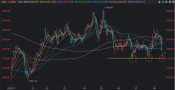 近2个月以来,上证指数围绕3150点关口累计共打响3次“保卫战”,其分别于6月26日、7月24日、8月14日(今日)一度触及或跌破3150点关口。从其后续的行情表现上看,沪指在6月26日与7月24日的两次“保卫战”后均迎来一定程度的反弹行情,以距离最近的高峰指数点位统计,其行情持续均近一周,且分别录得近3%、4%的阶段最大涨幅。