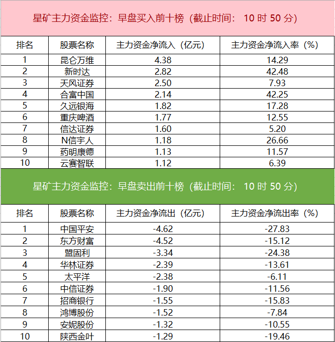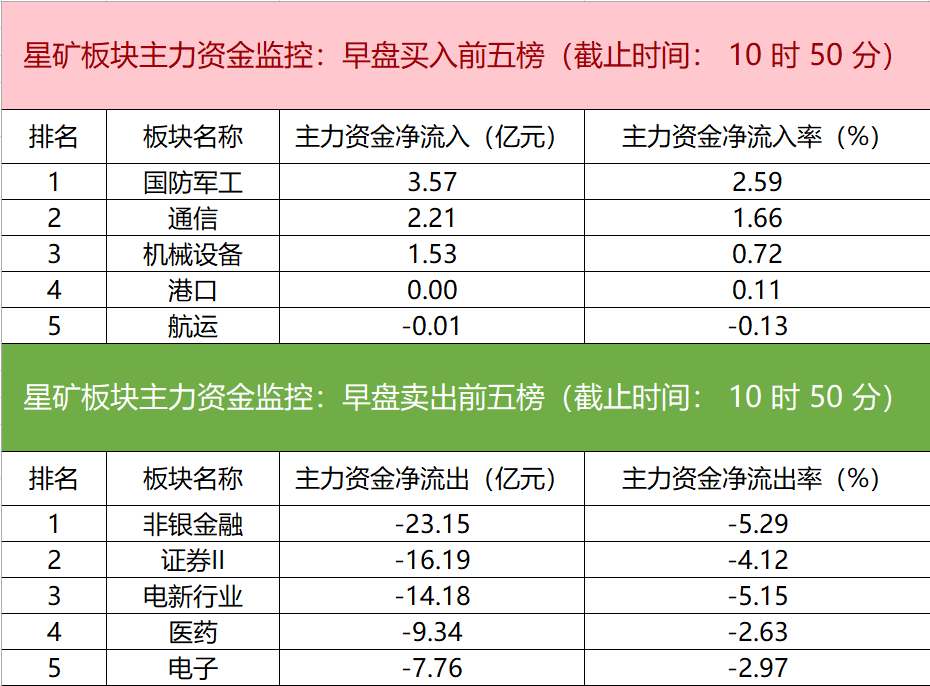 财联社8月17日电,财联社星矿数据显示,今日早盘主力资金净流入国防军工、通信、机械设备等板块,净流出非银金融、证券Ⅱ、电新行业等板块,其中非银金融板块净流出超23亿元。个股方面,昆仑万维大涨,主力资金净买入4.38亿元,新时达、天风证券、合富中国获主力资金净流入居前;中国平安遭净卖出超4亿元,东方财富、盟固利、华林证券主力资金净流出额居前。