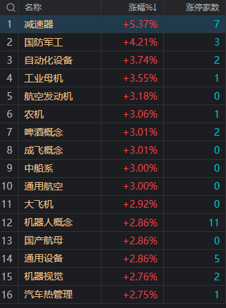 财联社8月17日电,大盘全天探底回升,三大指数均小幅上涨,创业板指早盘一度创出年内新低。盘面上,机器人、减速器概念股大涨,昊志机电、通力科技、新时达等超10股涨停。军工股迎来反弹,观想科技20CM涨停,长城军工、鸿远电子涨停。充电桩概念股开盘拉升,泰永长征、绿能慧充涨停。券商股全天反复活跃,国盛金控涨停。下跌方面,医药股集体调整,圣诺生物跌超5%。总体上个股涨多跌少,两市超3800只个股上涨。沪深两市今日成交额7398亿,较上个交易日放量356亿。板块方面,减速器、军工、啤酒、高压快充等板块涨幅居前,减肥药、银行、医疗器械、创新药等板块跌幅居前。截至收盘,沪指涨0.43%,深成指涨0.61%,创业板指涨0.66%。北向资金全天净卖出15.19亿元,其中沪股通净卖出7.66亿元,深股通净卖出7.53亿元。
