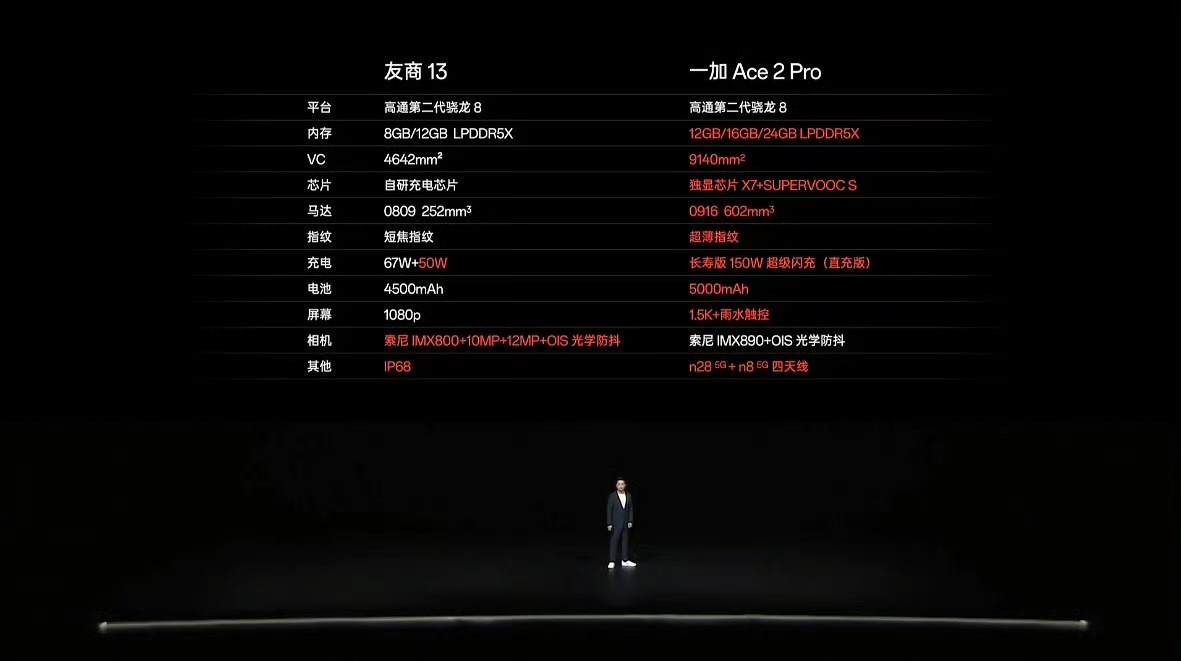 两日后举行的一加Ace2 Pro发布会上,一加也不甘示弱,直接晒图把一加Ace2 pro与小米13、红米K60至尊版进行比较。