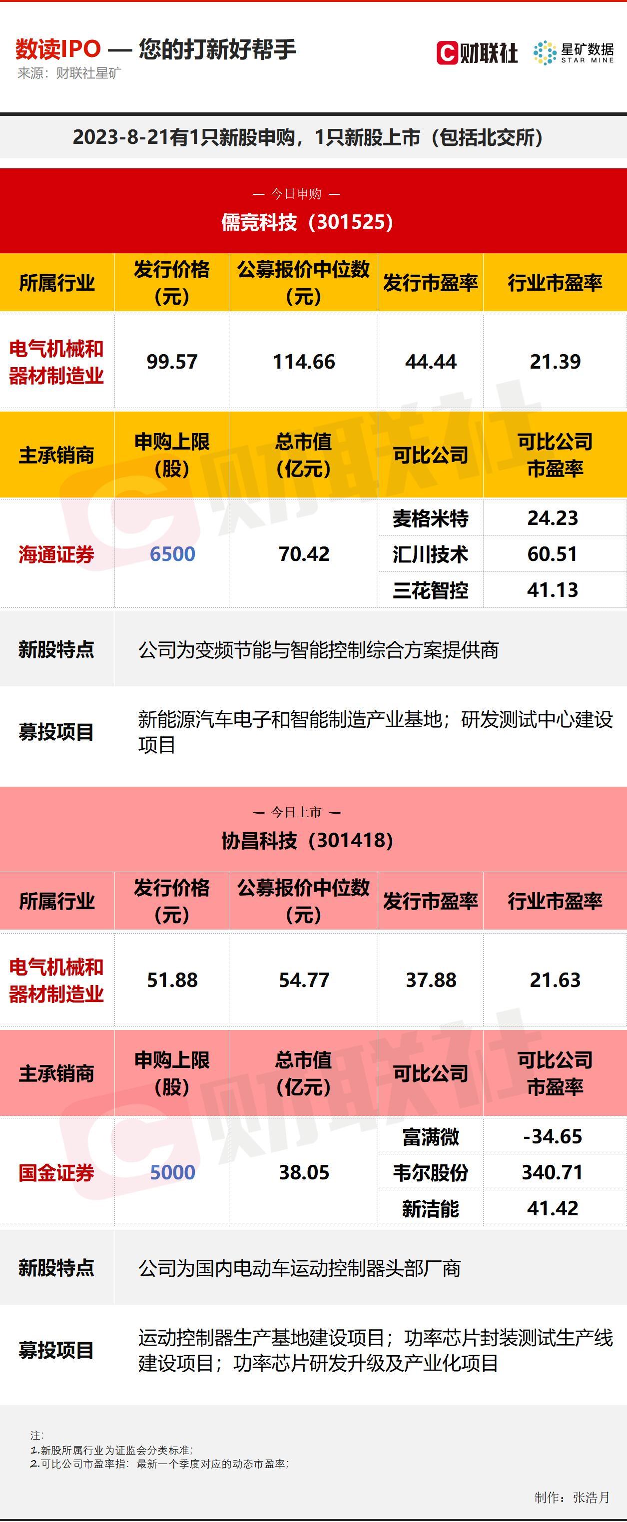 财联社8月21日电,今日有1只新股申购,为创业板的儒竞科技;1只新股上市,为创业板的协昌科技。