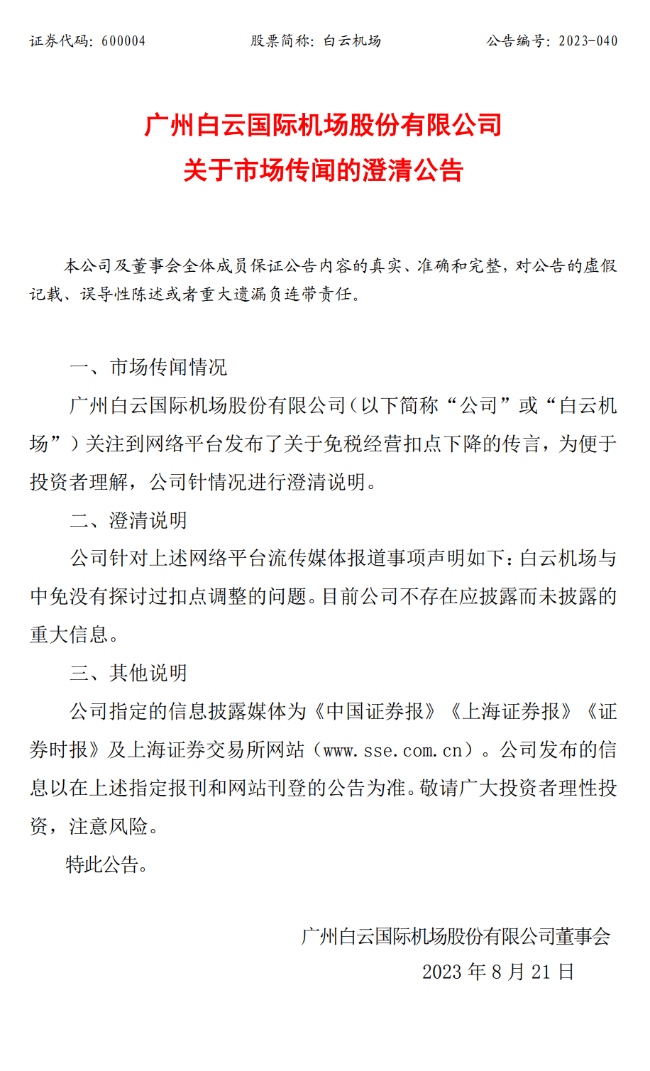 财联社8月21日电,白云机场发布澄清公告称,针对网络平台流传媒体报道事项声明如下:白云机场与中免没有探讨过扣点调整的问题。目前公司不存在应披露而未披露的重大信息。