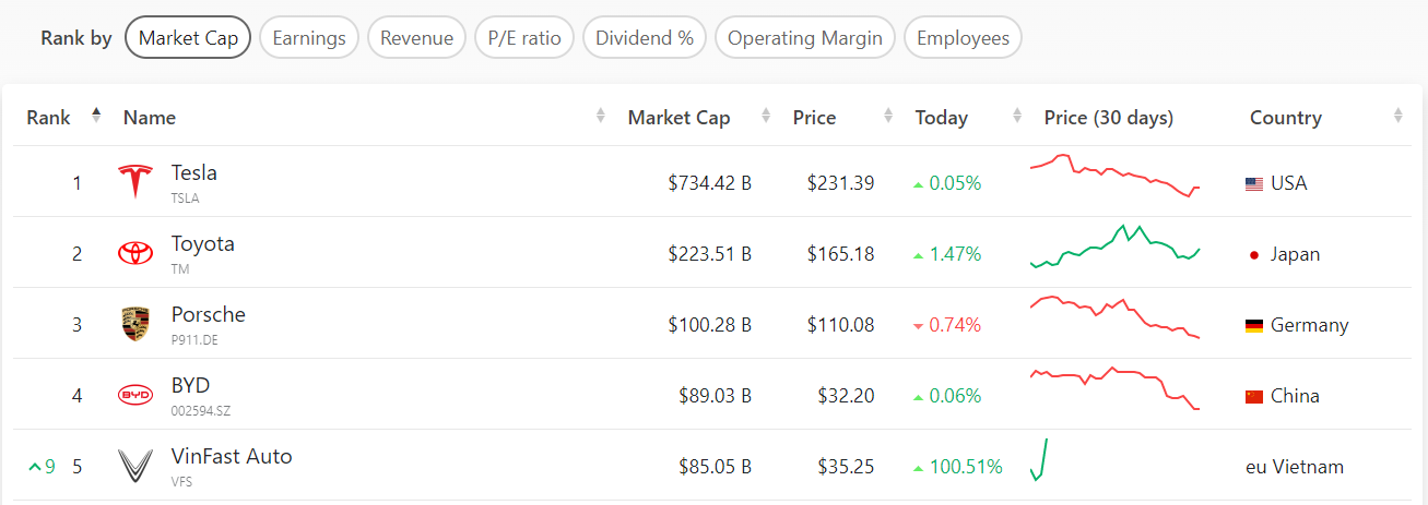 财联社8月23日电,越南电动汽车生产商VinFast持续飙升,现涨幅扩大至160%,市值站上1000亿美元,超越保时捷,成为全球市值第三的上市汽车股。
