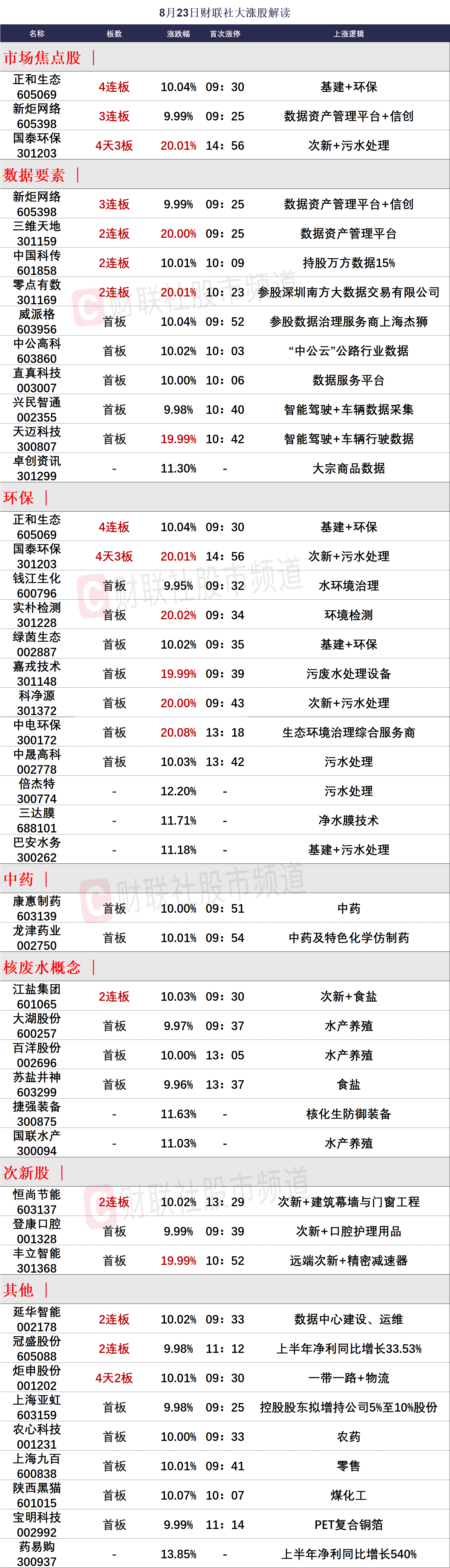 今日共35股涨停,连板股总数9只,6股封板未遂,封板率为85%(不含ST股、退市股及未开板新股)。个股方面,环保股正和生态4板、国泰环保创业板4天3板、实朴检测创业板首板,数据要素板块新炬网络3板、三维天地创业板2板、零点有数创业板2板、中国科传2板,核废水概念股江盐集团2板,次新股恒尚节能2板,数据中心板块延华智能2板,业绩增长的冠盛股份2板。今日收涨个股587只,收跌个股4388只。