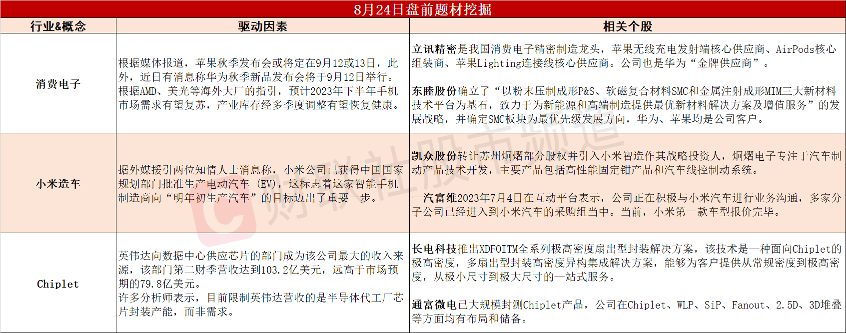 ①苹果、华为重磅发布会接踵而至,下半年手机市场需求有望复苏。②小米造车或已迈出关键一步,将为产业链带来全新机遇。③英伟达芯片销售远高于预期,芯片封装扩产迫在眉睫。