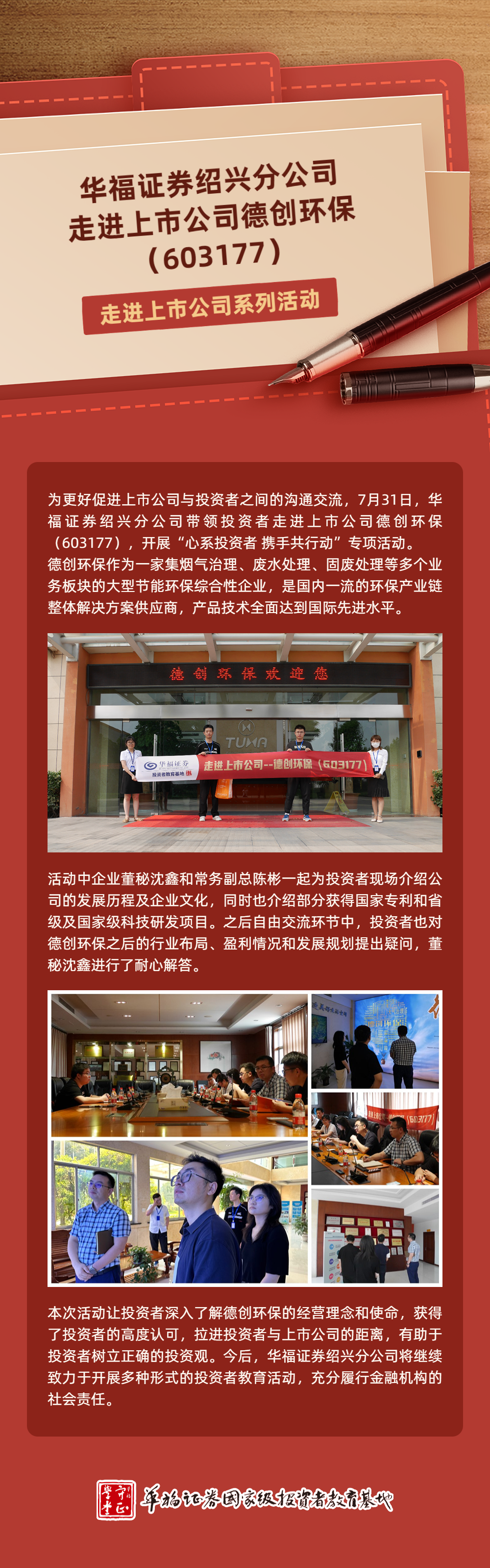 心系投资者 携手共行动 ——华福证券绍兴分公司走进上市公司德创环保(603177)