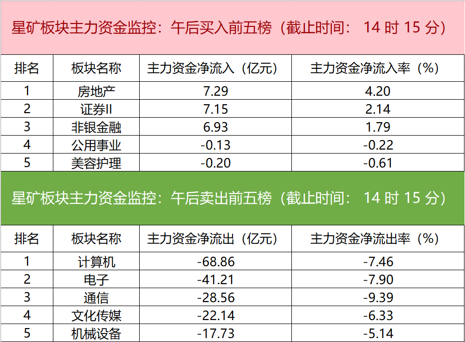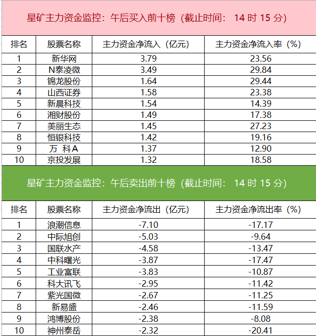 财联社8月25日电,财联社星矿数据显示,今日主力资金净流入房地产、证券Ⅱ、非银金融等板块,净流出计算机、电子、通信等板块,其中计算机板块净流出68.86亿元。个股方面,新华网大涨,主力资金净买入3.79亿元,N泰凌微、锦龙股份、山西证券获主力资金净流入居前;浪潮信息遭净卖出超7亿元,中际旭创、国联水产、中科曙光等主力资金净流出额居前。