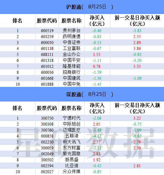 财联社8月25日电,北向资金今日净卖出24.01亿元。五粮液、东方财富、宁德时代分别遭净卖出4.12亿元、2.11亿元、2.08亿元。紫光国微净买入额居首,金额为2.83亿元。