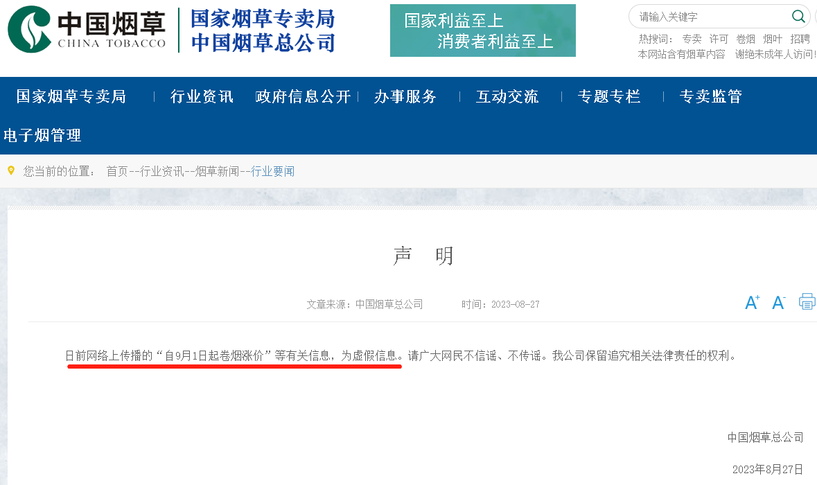 中国烟草总公司:“自9月1日起卷烟涨价”为假消息