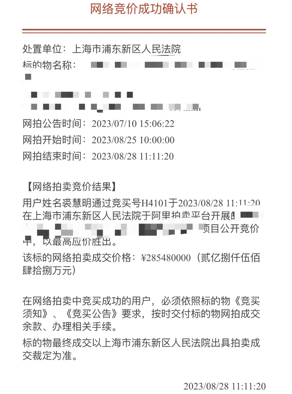 财联社8月28日电,今日淘宝阿里拍卖平台信息显示,上海某住宅区以2.85亿成交,流传出网络竞价成功确认书显示,用户姓名裘慧明通过竞买以最高应价胜出。财联社记者从多方核实,该买家为知名量化私募明汯投资的创始人、董事长裘慧明。(财联社记者 闫军)