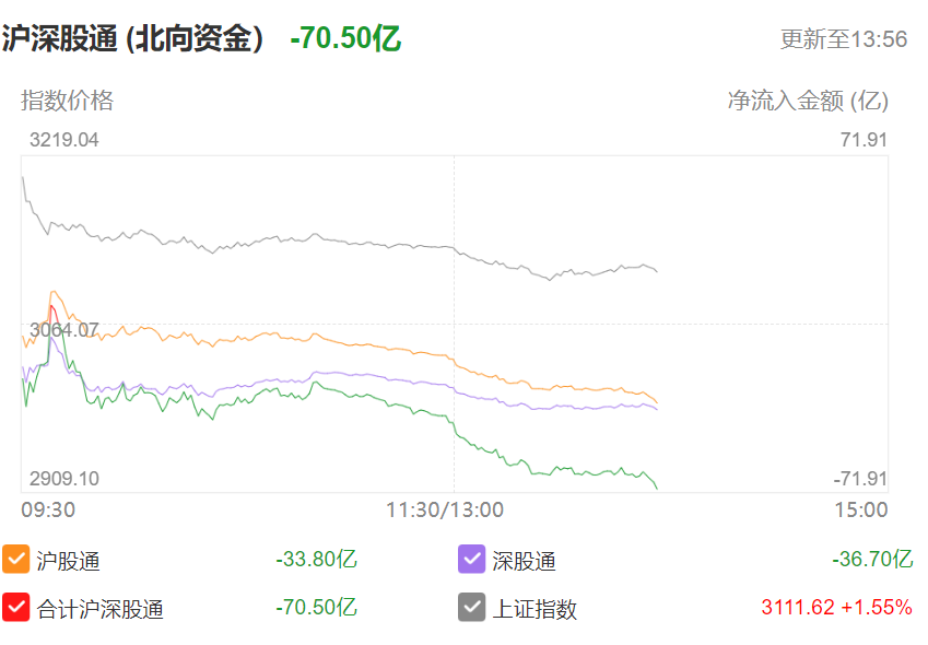 财联社8月28日电,截至发稿,北向资金净流出超70亿元,其中,沪股通净流出超33亿元,深股通净流出超36亿元。