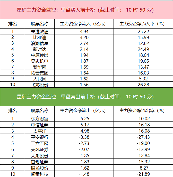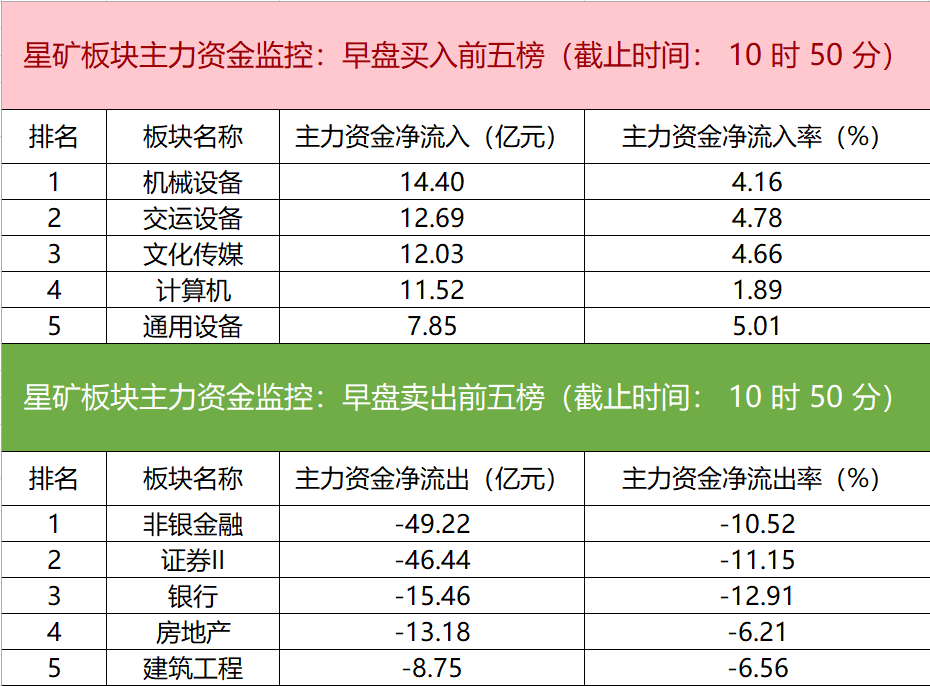 财联社8月29日电,财联社星矿数据显示,今日早盘主力资金净流入机械设备、交运设备、文化传媒等板块,净流出非银金融、证券Ⅱ、银行等板块,其中非银金融板块净流出超49亿元。个股方面,先进数通涨停,主力资金净买入3.94亿元,比亚迪、浪潮信息、新时达获主力资金净流入居前;东方财富遭净卖出超5亿元,中信证券、太平洋、平安银行主力资金净流出额居前。