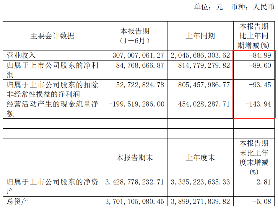 并且,因为营收和净利润的下跌,又拖累其他多个指标同步下跌。其中,经营活动现金净额同比减少6.54亿元,大幅下降143.94%;基本每股收益0.95元,同比下降89.27%;加权平均净资产收益率2.51%,同比减少22.94个百分点。