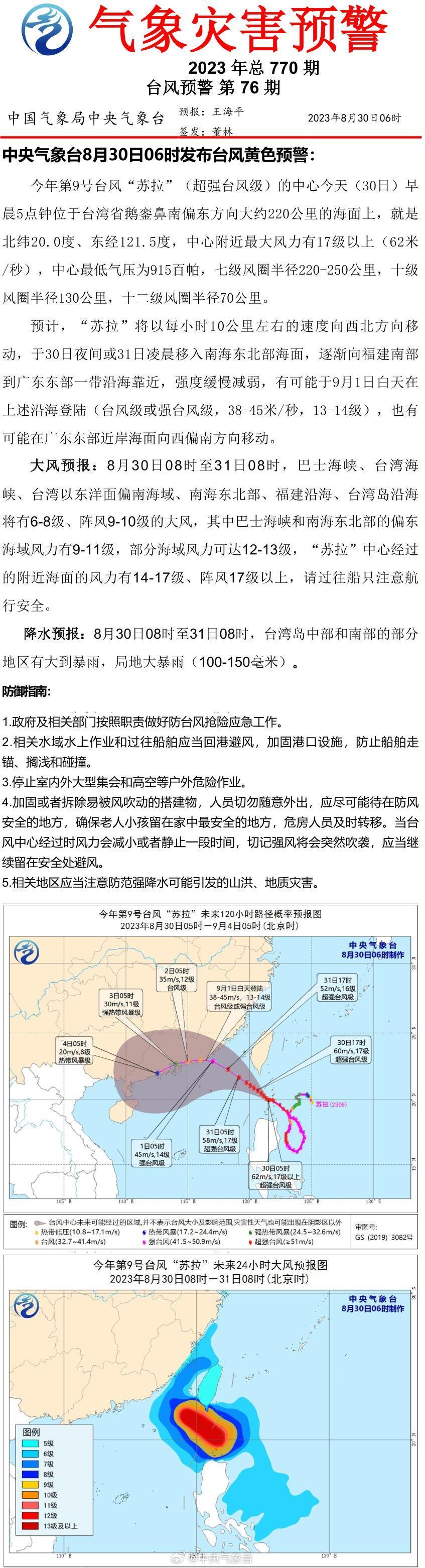 财联社8月30日电,中央气象台8月30日06时发布台风黄色预警。