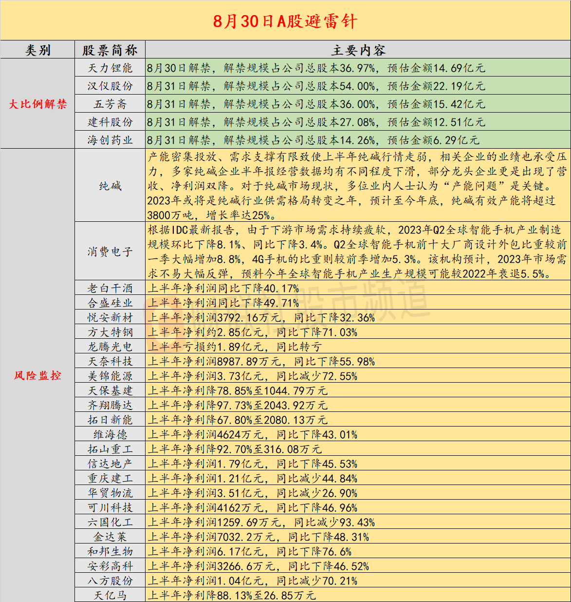 昨日没有公司发布减持公告;天力锂能、汉仪股份将迎来超三成以上解禁;大商所对黄大豆2号期货相关合约实施交易限额;老白干酒上半年净利润同比下降40.17%;需求追不上产能,多家纯碱企业中报业绩承压;合盛硅业上半年净利润同比下降49.71%;芝加哥农产品期货普跌下跌。