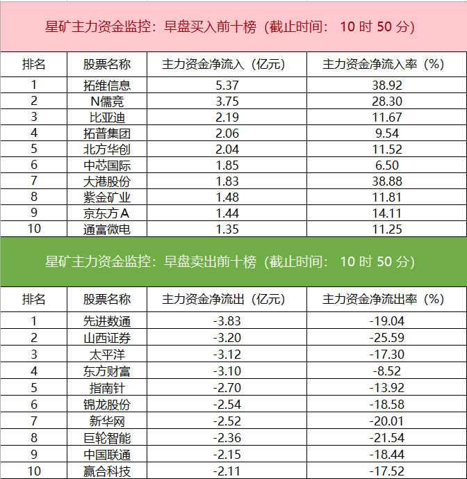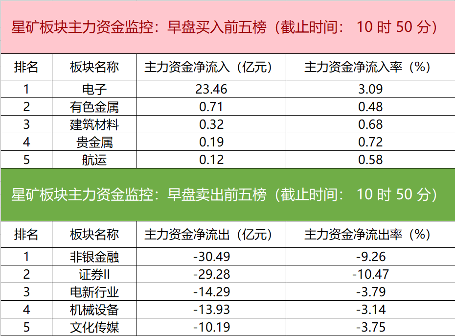 财联社8月30日电,财联社星矿数据显示,今日早盘主力资金净流入电子、有色金属、建筑材料等板块,净流出非银金融、证券Ⅱ、电新行业等板块,其中非银金融板块净流出超30亿元。个股方面,拓维信息涨停,主力资金净买入5.37亿元,N儒竞、比亚迪、拓普集团获主力资金净流入居前;先进数通遭净卖出超3亿元,山西证券、太平洋、东方财富主力资金净流出额居前。