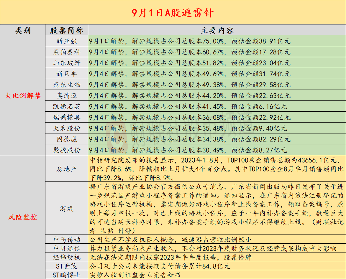 昨日没有公司发布减持公告;新亚强、莱伯泰科将迎来超六成以上解禁;北向资金8月累计减仓接近900亿元,单月净卖出额创历史新高;经纬纺机无法在法定期限内披露2023年半年度报告,股票停牌;1-8月TOP100房企销售总额下降8.6%;中贝通信公告,算力租赁业务尚未产生收入,不会对2023年度财务状况及经营成果构成重大影响;美股三大指数收盘涨跌不一,热门中概股普跌。