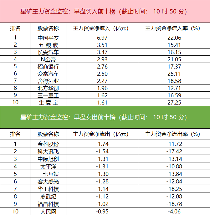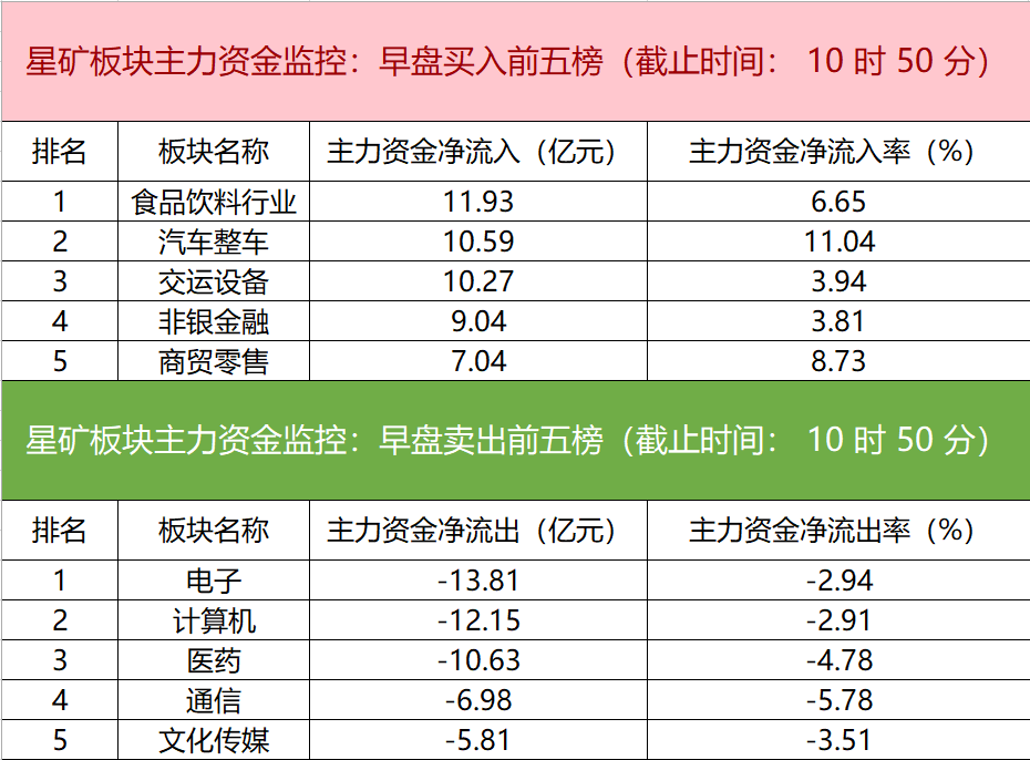财联社9月1日电,财联社星矿数据显示,今日早盘主力资金净流入食品饮料行业、汽车整车、交运设备等板块,净流出电子、计算机、医药等板块,其中电子板块净流出超13亿元。个股方面,中国平安上涨,主力资金净买入6.97亿元,五粮液、长安汽车、N金帝获主力资金净流入居前;金科股份遭净卖出超1亿元,科大讯飞、中际旭创、太平洋主力资金净流出额居前。